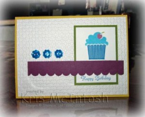 I used Daffodil Delight as my base cardstock and added a layer of Whisper White which is embossed using the Square Lattice Embossing Folder.  I stamped the cupcake images from the Create a Cupcake stampset in Pacific Point and Tempting Turquose onto Whisper White card and punched them out using the Build A Cupcake punch.  I inked the cherry using my Rich Razzleberry and Old Olive Stamping Write Markers and punched it out using the Build A Cupcake punch.  I added the cupcake images to a piece of Whisper White card and stamped the “happy birthday” from the same stampset at the very bottom of the Whisper White card using Pacific Point ink.  I attached the image panel to a layer of Old Olive card and attached it to the card front.  I punched one edge of a strip of Rich Razzleberry card using the Scallop Trim Punch and attached it using dimensionals over the image panel.  I added 3 of the Pacific Point buttons from the promotional gift bundle as a final touch.
