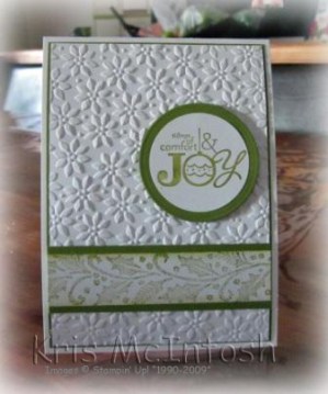 This sketch was a Sudsol challenge last week.  I didn’t get around to it on time but created this card anyway.  Someone was asking about easy Christmas cards and I don’t think it could get much easier than this.  I used Whisper White as my card base and added a layer of Old Olive.  The next layer of Whisper White is embossed using the Petals-A-Plenty Embossing Folder.  I rolled the Soft Holly standard wheel onto Whisper White card using Old Olive ink and added an Old Olive mat.  This is attached to the lower part of the card front.  I stamped the greeting from the Word Play stampset using Old Olive ink and punched it out using the 1 3/4″ circle punch.  I added an Old Olive mat cut with the Circle Scissors and attached this to the card front using dimensionals.