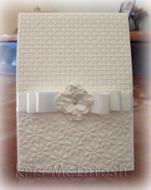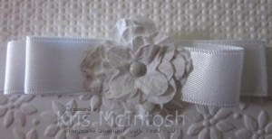 I ran a piece of Whisper White card through the Big Shot using two embossing folders at once.  I used the Square Lattice Embossing Folder on the top two-thirds and the Petals-A-Plenty Embossing Folder on the bottom third.  When you do this you get a little section between the folders which has no texture.  I created a double bow effect with the Whisper White 5/8″ Grosgrain Ribbon and attached it over the “blank” section of white card.  I used Mini Glue Dots to hold everything in place.  Of course, then I attached it to my Whisper White base card.