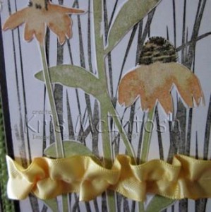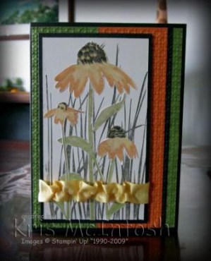 I wanted to add some more colour to this example so I took a piece of Pumpkin Pie card and added a strip of Early Expresso card to the right hand side and then layered it onto a piece of Old Olive card and then I ran the whole piece through the Big Shot using the Square Lattice Embossing Folder.  This piece was attached to the folded and scored Early Epresso base card.  I stamped the reed image from Inspired by Nature onto Very Vanilla card using Early Expresso ink.  Then I inked the flower image using my Stampin’ Write Markers.  I used Old Olive for the leaves and inked the flowers with Daffodil Delight and then added some Pumpkin Pie and Early Expresso to add more dimension to the flowers.  I stamped the flowers onto Very Vanilla card and then cut them out.  I attached them over the reeds using snail and then added an Early Expresso mat.  I gathered a piece of Daffodil Delight 5/8″ Satin Ribbon and attached it over the bottom of the whole piece.  The image panel is added to the card front using dimensionals.