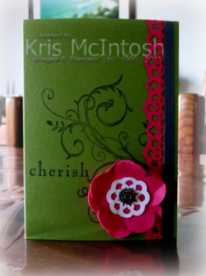 I didn’t have the same stampsets and I did change the colours but the essence of the card is still the same. I scored and folded Old Olive card and then stamped the swirl image from the Baroque Motifs stampset onto the card front using Basic Gray ink. I punched a strip of Melon Mambo card using the soon to be released Lace Ribbon Border Punch (you are going to love this one). I attached it to the right hand side of the card front, trimming to match the card front. I attached a narrow strip of Basic Gray card to a slightly wider strip of Old Olive card and then attached it to the right hand side of the card front over the Lace Ribbon Border. I punched two Fancy Flowers from Melon Mambo card and also punched the Lace Ribbon Border Punch on a scrap of Whisper White card and trimmed it so that I had one doily shaped piece. I did use my bone folder on the Fancy Flowers to soften them a little and then attached the Fancy Flowers and the Whisper White doily together using a Vintage brad. I stamped “cherish” from the Baroque Motifs stampset onto the card front making sure that the flower wouldn’t hide it. I scrunched the petals of the Fancy Flowers a little and then added it to the card front using dimensionals.