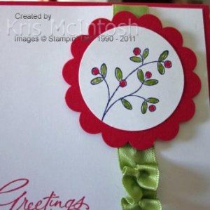I stamped “seasons greetings” from the Many Merry Messages stampset onto Whisper White card.  I gathered one end of a piece of Old Olive 5/8″ Satin Ribbon and attached it to the right hand side making sure that the gathers were at the bottom of the card front.  I attached the Whisper White card to a scored and folded base card of Real Red.  I stamped the “christmas” image from the Easy Events stampset onto Whisper White card using Basic Black ink.  I coloured the image using my Real Red and Old Olive Stampin’ Write Markers and then punched the image with the 1 3/4″ circle punch.  I attached the image to a Real Red 2 3/8″ Scallop Circle and then to the card front over the ribbon using dimensionals.