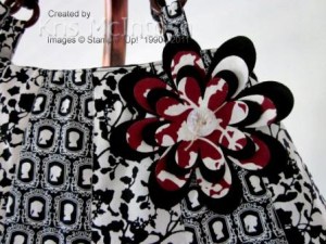 I used a free on-line pattern which can be found here and the gorgeous Timeless Portrait fabric to create this bag. The fabric comes packed really neatly in a box – 3 fat quarters to each pack. I used two of the fabrics to create the bag and added the “red” fabric to the flowers for effect. I also used some addtional black fabric to make the lining and I purchased the handles. I actually increased the size of the pattern piece to get a larger bag.