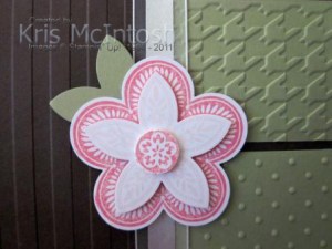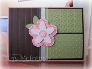 I embossed the left hand side of a piece of Early Expresso cardstock using the Stripes Embossing Folder. I embossed the Pear Pizzazz card, one piece with the Perfect Polka Dots Embossing Folder and the other with the Houndstooth Embossing Folder and attached them to the Early Expresso card. I wrapped a piece of Whisper White 5/8″ Organza ribbon around the whole piece and attached it to scored and folded Blushing Bride Card. I stamped the Triple Treat Flower onto Whisper White card using Regal Rose ink twice and Blushing Bride ink once. I punched one Regal Rose image out completely using the Fancy Flower Punch and I punched the centre from the other Regal Rose flower using the 1/2″ circle punch. I used the 5 Petal Flower Punch to punch that section of the stamp from the Blushing Bride image. The images were layered on top of each other with dimensionals between the layers. I punched a 5 Petal Flower from Pear Pizzazz card, cut out 2 of the petals and attached them to the back of the flower. The whole flower was then attached to the card front, again using dimensionals.