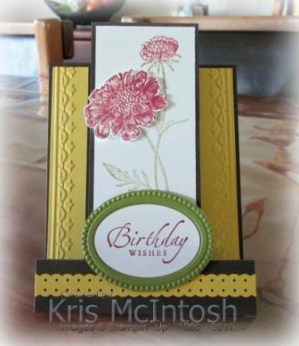 I love this fancy fold design. I used Early Expresso as the base card and added accents on the side panels in Daffodil Yellow. These Daffodil Yellow panels have been embossed using the Framed Tulips Embossing Folder. The bottom edge of the card has been adorned with a strip of Daffodil Delight card punched using the new Dotted Scallop Ribbon Border Punch. For the main image panel the leaves from the Field Flowers stampset were stamped using Old Olive ink. I stamped the small flower using Cherry Cobbler ink directly onto the card. The base image was stamped off once onto scrap paper. The large flower was stamped onto scrap Whisper White card using Cherry Cobbler ink, again the base image has been stamped off once and cut out. This flower has been attached to the image panel using dimensionals.