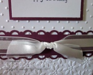 To cover this I cut a strip of Rich Razzleberry card and punched both long edges with the Scallop Trim Border Punch.After attaching this strip to the Whisper White card I wrapped it with Whisper White 5/8″ Organza Ribbon and tied a knot. This whole piece was then attached to the card front.