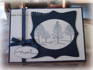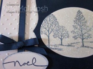 I decided to go with Night of Navy and Whisper White for this Christmas card. I also wanted to make something using heat embossing. I embossed a piece of Whisper White card stock using the Perfect Polka Dots Embossing Folder and wrapped the left hand side with Night of Navy 1/4″ grosgrain ribbon. This piece was then attached to the scored and folded Night of Navy card stock base card. I cut a Top Note from Night of Navy card stock and then cut it again so that I got this fancy square shape. I cut the largest oval using the Ovals Originals Die from Whisper White card stock and stamped the tree image from the Lovely as a Tree stampset using Night of Navy ink. I then used my Versamark ink pad to ink the whole of the oval. I added Heat and Stick powder and heat set it and then added Dazzling Diamonds and heat set it again. I love these shimmery panels, they look so Christmassy – even though we don’t get snow in Australia at Christmas (well not regularly anyway). I attached the Whisper White Oval to the fancy Top Note and then attached it to the right hand side of the Whisper White card. I inked “noel” from the Many Merry Messages stampset firstly with Versamark and then with Night of Navy ink and stamped onto Whisper White card.