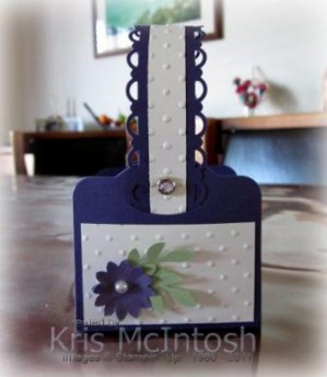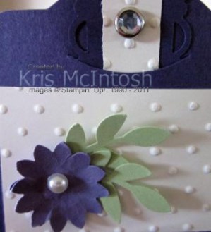 I won’t go into the details of how to make it, you can get all that clearly and easily from Cindee’s tutorial (thanks Cindee). However I used Elegant Eggplant card stock to cut the two large tags from the Two Tags Bigz Die. I also used the same card stock to create the little box section to join the two tags together. I added pieces of Very Vanilla card stock which have been embossed using the Perfect Polka Dots embossing folder to the front and back of the box. I punched the largest flower from the Boho Blossoms Punch from Elegant Eggplant card stock and used my bone folder to give it a little shape. I punched two sets of leaves from Certainly Celery card stock using the Bird Builder Punch and attached them behind the flower. I used Mini Glue Dots to attach the flower and leaves to the basket and added a large Basic Pearl to the centre. I cut the handle from Elegant Eggplant card stock and punched both long edges with the Scallop Trim Border Punch. I added a strip of Very Vanilla card stock which is embossed using the Perfect Polka Dots Embossing Folder. I slipped the ends of the handles through the slot in the Tag and then using the hole which is already in the tag as a guide pierced through the handle and added a Clear Rhinestone Brad to hold the handle in place.