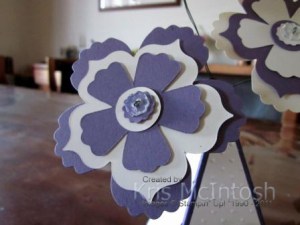 All the pieces for the flowers were cut using the Fun Flowers Bigz L Die.  I used Perfect Plum cardstock and Very Vanilla.  For the flower at below I just stacked the pieces together alternating colours with a Bitty Button in the centre.  I threaded florest wire through the button and then through the centre of the flower shapes.