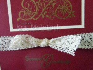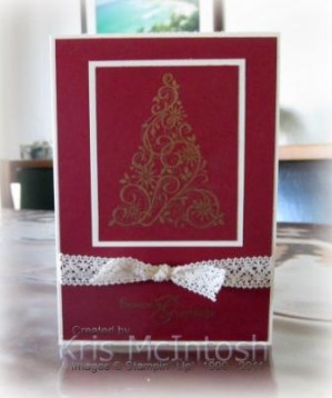 I stamped the tree from Snow Swirled onto Cherry Cobbler card stock using Versamark ink – after rubbing the cardstock with my embossing buddy. I sprinkled on Gold Embossing Powder, tapped off the excess and then used the Heat Tool to set the embossing powder. I added the tree panel to a layer of Very Vanilla card stock and set it aside. I stamped “seasons greeting” from the Snow Swirled stampset onto the bottom of another piece of Cherry Cobbler Cardstock using Versamark ink. I sprinkled on Gold Embossing Powder and heat set it using the Heat Tool. I added a piece of Victoria Crochet Trim and tied it in a knot. I attached the greeting piece to scored and folded Very Vanilla card stock. Lastly I attached the tree panel to the card front.