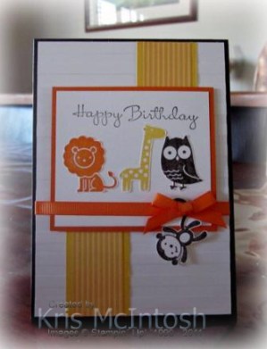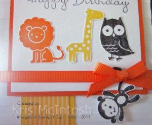 I stamped the giraffe image onto Whisper White card using Daffodil Delight ink and cut the image out. I stamped the owl and the monkey onto Whisper White card using Early Expresso ink and cut both images out. I attached the lion, giraffe and owl to a piece of Whisper White card stock and stamped happy birthday from the Happiest Birthday Wishes stampset using Early Expresso ink. I attached the Whisper White card stock to a layer of Pumpkin Pie card stock. The image panel was then attached to the Whisper White card stock over the top of the Designer Paper panels using dimensionals. I wrapped this piece with Pumpkin Pie 1/4″ Grosgrain ribbon. I hung the monkey from the ribbon and then attached a bow tied from the same ribbon using a Mini Glue Dot. The whole piece was then attached to scored and folded Early Expressso card stock.
