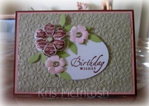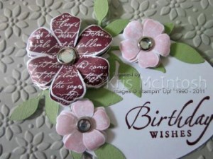 My base card is Bravo Burgundy card stock and I have added a layer of Pretty in Pink card stock and then a layer of Sahara Sand card stock which has been embossed using the Petals-a-Plenty Embossing Folder. I cut the largest oval from the Ovals Originals Die from Whisper White card stock. I stamped the large flower from the Vintage Vogue stampset using Bravo Burgundy ink onto Whisper White card and cut the flower out. I stamped the small flower from the Vintage Vogue stampset onto Whisper White card stock using Pretty in Pink ink and cut them out.