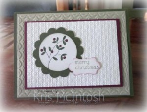 I stamped the image from the Easy Events stampset onto Whisper White card using Black Stazon ink. I coloured the image using my Rich Razzleberry and Always Artichoke Stampin’ Write Markers. I punched the image using the 1 3/4″ Circle Punch, sponged the edges with Always Artichoke ink and added it to an Always Artichoke 2 3/8″ Scallop Circle. I attached the image panel to the card front using Mini Glue Dots. I stamped “Merry Christmas” from the Easy Events stampset onto Whisper white card using Always Artichoke ink. I punched the image using the narrow end of the Decorative Label punch and then re-inserted it into the punch so that you get this cute little frame. I sponged the edges with Rich Razzleberry ink and then attached it to the card front using dimensionals.