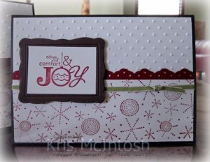 I used Cherry Cobbler ink and the Sassy Sparkles Jumbo Wheel to cover another piece of Whisper White card stock. I punched one long edge of a narrow piece of Cherry Cobbler card stock using the Eyelet Edge Border Punch attached this behind the wheeled panel, wrapped it with Old Olive 1/8″ Taffeta ribbon and tied a knot. This piece was then attached to the card front. I embossed a piece of Early Expresso card stock using the “rectangle” Designer Frame Embossing Folder and then cut the frame out. I stamped the greeting from the Word Play stampset onto Whisper White card stock and attached it inside the rectangle frame. The greeting was attached to the card front using dimensionals.