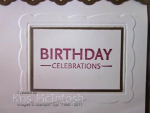 I stamped the greeting from the Upsy Daisy Stampset onto Whisper White card stock using Rich Razzleberry ink and my stamp-a-ma-jig to get perfect placement.  I added a mat of Soft Suede card stock and then attached it to the  middle of my embossed frame.