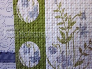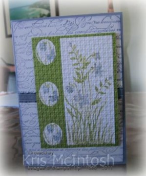 I stamped the image the same way 3 more times and punched the same section using the Small Oval Punch. I added the stamped Whisper White card stock to Lucky Limeade card and then ran the whole piece through the Big Shot using the Square Lattice Embossing Folder. This piece was then attached to the card front using dimensionals.