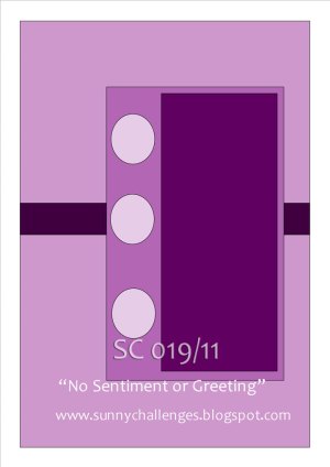 The sketch this week at Sunny Challenges and Creations is brought to us by Vicky. As well as using the sketch Vicky has decided that no matter what type of card you make, you are not allowed to add a greeting. Seems simple, not exactly.. I had to really think hard to come up with something for this sketch and to be honest, I am not really sure that I like it. So please let me know what you think.