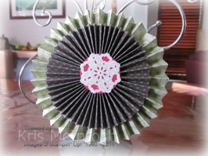 This next ornament is made following some instructions I found in the Christmas edition of the Better Homes and Gardens Magazine. I cut 3 strips of 12 x 12 ” designer paper 60cm wide using Old Olive Designer Paper from the Brights Patterns Designer Series Paper Stack 6cm wide. These strips were scored every 1/2″ and folded concertina fashion and joined end to end and then together to make a ring. I cut 2 strips of 12 x 12″ Chocolate Chip Designer Series Paper from the Neutrals Patterns Designers Series Paper Stack 4cm wide. These strips were scored every 1/4″ and joined end to end and then together to make a ring.