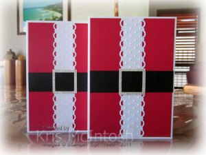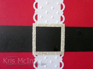 I started with a base care of Whisper White and added a layer of Real Red.  (Look no embossing).  I punched the long edges of a piece of Whisper White card using the Scallop Trim Border punch and then embossed the centre panel using the Perfect Polka Dots Embossing folder.  I added a strip of Basic Black card and then using a piece of Silver Glimmer paper punched a 1″ square I used the 1 1/4″ square and punched around the 1″ square making sure to centre it.  I added this piece to the Basic Black strip to make the “buckle”.  I kept the inside of this card plain as well but did add “Ho Ho Ho” to the inside.  I cut the letters from Real Red cardstock using the Timeless Type Junior Alphabet.