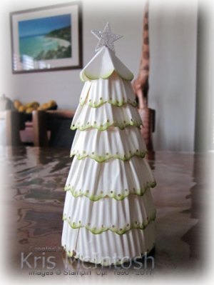 I cut strips of Very Vanilla card stock and punched one long edge using the Eyelet Border Punch. I sponged Old Olive ink onto the punched edges. I ran each piece through the crimper several times until the card stock was nice and pliable. I started at the bottom of the cone and used dressmaker pins to attach the card stock to the polystyrene cone. I made sure that the bottom of each piece fitted around the cone and then attached the top in 4 places and then just kind of squished the paper to the cone and added pins to keep it in place. How to cover the top had me a bit stumped at first but then I decided to punch a 2 3/8″ Scallop Circle from Very Vanilla card stock and score through the scallops. I also sponged the edges with Old Olive ink. I cut through one of the score lines until I reached the centre of the circle and then cut one scallop away. I concertina folded the score lines and then used Tombow Multipurpose glue to join the scallop together again. I attached this to the tree using Tombow Multipurpose Glue. I punched 2 stars from Silver Glimmer paper using my Star punch (retired) and joined them together back to back with a toothpick between the layers. I then pushed the toothpick into the top of the cone through the Scallop Circle and there you have it – my version of the paper Christmas Tree.