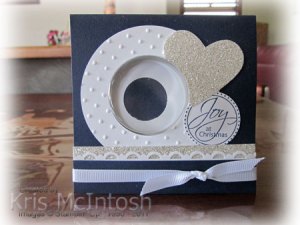 I used Night of Navy card stock to create the basic matchbook. The photo doesn’t really show it well, but there is a Round Treat Cup in the centre of the embossed cardstock which is where I will be adding my treat. I used a combination of Whisper White and Silver Glimmer Paper to decorate the box. I also used a variety of punches – Full Heart, 1 1/4″ Circle, 1″ Circle, 1 3/4″ Circle, Scallop Trim Border Punch as well as the Circle Scissors to create my 3″ circle. I also used the Perfect Polka Dots embossing folder to add a little texture. The greeting comes from the Perfect Punches stamp set and I used Night of Navy ink to stamp it. I just need to find something to add to the Treat cup. I am thinking Red Smarties or M&M’s would look fantastic. The little matchbook opens and the treat holder swings out so that the treat can be eaten without destroying the holder.