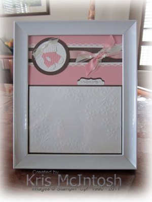 My husband and I have friends expecting their first child any day now and I thought that I would create a photo frame for them to use for a photo of their newborn. We don’t know if it is a girl or a boy so I created this prototype for a girl. I will have to whip up another one in blue if it is a boy. I embossed a piece of Whisper White card stock using the Elegant Bouquet Embossing Folder and added it to a layer of Chocolate Chip card stock. I attached this to Pretty in Pink card stock only on the sides and across the bottom. I made a tag to slide behind the photo to record the date, time, weight and length.