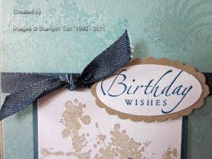 I attached this panel to Not Quite Navy card stock and then to the stamped Baja Breeze card stock. I wrapped the Blue Denim Jean Ribbon around this whole piece, tied a knot and then attached it to the Crumb Cake base. I stamped the greeting from the Sincere Salutations stampset onto Whisper White card stock using Not Quite Navy ink and punched it out with the Large Oval Punch and attached it to a Crumb Cake Scallop Oval. The greeting is attached to the card front over the ribbon using dimensionals.