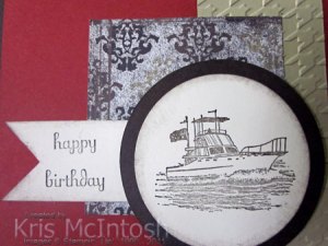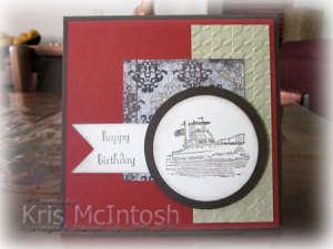 I stamped the ship image from the Seaworthy stamp set using Early Expresso ink and punched the image using the 2-1/2″ Circle Punch. I sponged the edges lightly with Early Expresso ink. I cut the Early Expresso mat using the Circle Scissors and then attached the image to the front of the card. I really love the colours and the texture in this card. I have been saving this designer paper (heaven’s knows why) but it is really gorgeous and I will have to break it out more often. I think the colours work really well for male cards.