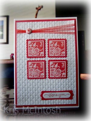 I started with Very Vanilla card stock and added a layer of Calypso Coral. I embossed a layer of Very Vanilla card stock using the Square Lattice Embossing Folder. I wrapped some of the Calypso Coral 1/8″ Organdy Ribbon around the top of the embossed Very Vanilla card, added a Printed Designer Brad around the ribbon and attached it to the card front. I stamped the square image from the Fresh Vintage stampset onto Very Vanilla card stock using the Calypso Coral four times and punched them out using the 1″ Square Punch. I attached them to Calypso Coral card stock which has been punched using the Postage Stamp Punch