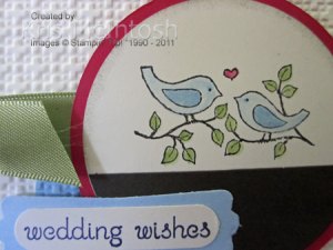 Chocolate Chip card using the 2-1/2″ Circle Punch and attached it below the image. I cut Real Red card stock to create a mat for the image panel and then attached it to the card front using dimensionals. I stamped wedding wishes from the same stamp set (actually from the same image) using Basic Black ink onto Very Vanilla card and punched the greeting using the Word Window Punch. I cut Bashful Blue card stock using the Modern Label Punch, attached the greeting to it and then to the card front using a dimensional under the left hand side and Snail under the right hand side. This lets the greeting “sit” on the image panel.