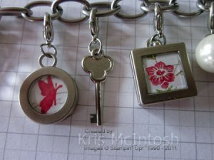 To make the panels for the Square Charm I stamped the same background image using Crumb Cake ink and then over stamped with the flower image which I inked using my Real Red and Olive Green Stampin’ Write Markers. Then I cut the images to size and inserted them into the Square Charm. On my Bracelet I have the two charms already mentioned and one Trinket Key. I also have one each of all the baubles that are available for purchase – Black crystal, Clear Crystal, Pink Crystal and Vanilla Pearl.