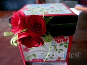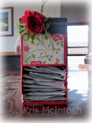 Kris, this is a beautiful tea dispenser. What a lovely way for your mum to serve tea bags when having guests over for tea! I love, love, love your three roses … I have made rolled flowers before, but they never turned out as nice as yours … need to practice. Beautiful mix of papers and colors.