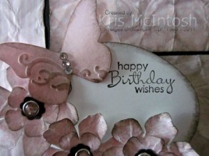 I kind of flattened them out and attached them to the scored and folded Early Expresso base card. I cut Whisper White card using the largest oval on the Ovals Originals Die, stamped the greeting from the Petite Pairs stamp set using Early Expresso ink and then sponged the edges using Early Expresso ink. I stamped the large and small flower from the Vintage Vogue stamp set using Pink Pirouette ink onto scrap Whisper White card stock and cut them out. I sponged the edges with Early Expresso ink and scrunched each of them into a ball and opened them again. I punched 3 Early Expresso flowers using the flower punch from the Itty Bitty Punch Pack. I stacked the flowers with the Early Expresso flower on top, pierced a hole with my paper piercer and then inserted a medium Clear Rhinestone Brad. I attached these around the oval using Mini Glue Dots. I cut Pink Pirouette card stock using the Beautiful Wings Embosslit.