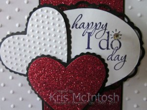 I attached the greeting panel to the card front using dimensionals. I used the Scalloped Heart of Hearts Embosslit on Basic Black card stock, cutting two hearts. I punched one Whisper White Full Heart and placed it inside the Scalloped Heart of Hearts Embosslit to emboss the Whisper White card. I attached this on top of one of the Basic Black Scalloped Hearts. I punched Red Glimmer Paper using the Full Heart Punch and attached it to the other Basic Black Scalloped heart. I attached the hearts to the left hand side of the stamped Whisper White Oval. Lastly I added a medium Basic Rhinestone above the “o” in “do”.
