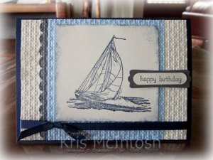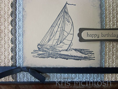 I cut a narrow strip of Basic Gray card stock and punched one long edge using the Scallop Border Punch. I attached this piece behind Bashful Blue card stock and then attached the whole piece to Very Vanilla card stock. I ran this through the Big Shot using the Square Lattice Embossing Folder. I stamped the boat from the Seaworthy stamp set onto Very Vanilla card stock using Night of Navy ink. I punched the top right hand corner using the 3/16″ corner rounder, sponged the edges with Night of Navy ink and attached it over the Bashful Blue card stock.