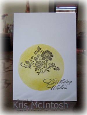 I started with Whisper White card stock and used a die cut negative of a 3″ circle.  I sponged Daffodil Delight ink inside the circle and then stamped the image from the Sale-A-Bration Fresh Vintage stamp set over the top of the sponging using Early Expresso ink.  I stamped “happy birthday” from the Bring on the Cake stampset straight onto the card front again using Early Expresso.