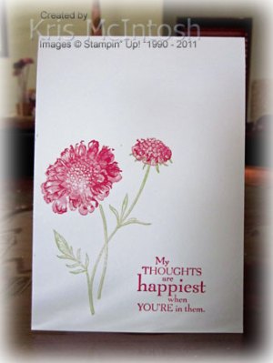 I decided to have a play and make another card.  This one also starts with Whisper White card stock.  I stamped the stem image from the Field Flowers stamp set using Certainly Celery ink.  I stamped the flowers using Rose Red ink straight onto the card front.  I also stamped the greeting from the same stamp set again using Rose Red ink.