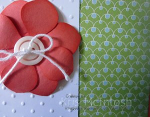 I cut a piece of the Everyday Enchantment Designer Series Paper and attached it to scored and folded Calypso Coral card stock. I ran a piece of Whisper White card stock through the Big Shot using the Perfect Polka Dots Embossing Folder and attached it to the left had side of the card front. I punched eight petals from Calypso Coral card stock using the Blossom Petals Builder Punch. I used Calypso Coral ink to sponge the edges of each petal and then curled the petals slightly with my bone folder.