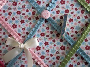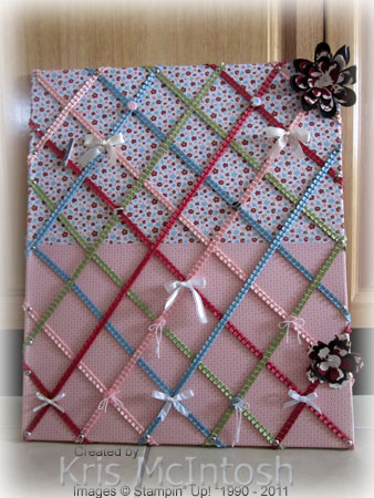 I have needed a small display board that is light and portable for a long time and finally got around to making one. I bought a canvas from one of the $2.00 shops and covered it with the Twitterpated Designer Fabric which is being released on the 1st April in the Autumn/Winter Mini Catalogue. The fabric is really pretty and pink, very girly. Along with this gorgeous fabric we are also getting some beautiful pleated 3/8″ Satin Ribbon. The ribbon comes in four colours – Pear Pizzazz, Ridinghood Red, Blushing Bride and Baja Breeze – which match the colours in the fabric. So I used this ribbon to decorate the board as well.