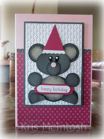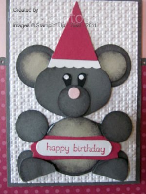 I punched a narrow strip of Basic Gray card stock using the Dotted Scallop Ribbon Border punch and attached it behind Rose Red Designer Series Paper.   This piece was then attached to scored and folded Pretty in Pink card stock.  I embossed a piece of Whisper White card stock using the Square Lattice Embossing Folder and attached it to Basic Gray card stock.  This piece is attached to the card front using dimensionals.  My punch art bear is one that I cased from the Queen of Punch Art (in my humble opinion) – Kim Score.  I did change a couple of things because I didn’t have the right punches.  I made my party hat using the Petite Pennants Builder Punch –  I used Rose Red card stock and the plain pennant and attached a strip of Whisper White card stock to the bottom which I punched using the Scalloped Pennant and then trimmed.  I also used the smallest heart on the Heart to Heart Punch and cut it in half to make the eyes and then added the smallest circle from the Owl Builder Punch.  I also used Sahara Sand card stock instead of Going Gray because it is retired and I don’t have any on hand.  So I sponged the edges of the Sahara Sand card stock using Basic Gray so that it blended in better.