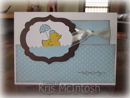 So very cute Kris. I love this little duck, & the way he is swimming in the water….. Great baby’s card!