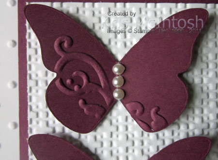 I attached these to the card front using a Mini Glue Dot in the centre of the body of the butterfly and half a dimensional under each wing. I cut 3 Basic Pearls and attached them to each of the butterflies.