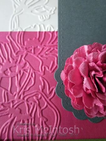 Kris, I love your choice of colours. That embossing folder hasn’t ever appealed to me, but I must say it looks BEAUTIFUL!! Love the way you’ve positioned that glorious flower on the tag – great idea. Lovely, lovely card!