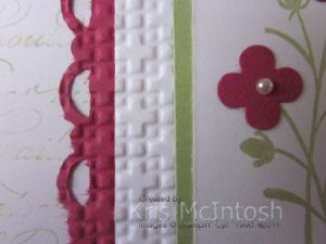 I stamped the En Francaise Background onto Whisper White card stock using Certainly Celery ink making sure that I didn’t apply too much pressure, I wanted a kind haphazard impression. I also sponged the edges of this card lightly with Certainly Celery ink and then attached it to scored and folded Basic Gray card stock. I punched one long edge of a strip of Rose Red card stock using the Scallop Trim Border Punch, attached it to a piece of Whisper White card stock and then embossed the whole piece using the Square Lattice Embossing Folder. I stamped the image from the Pocket Silhouettes stamp set onto Whisper White card stock using Certainly Celery ink – twice – and then attached the image panels to Certainly Celery card stock. I punched the flowers from Rose Red card stock using one of the punches from the Itty Bitty Punch Pack, attached them to the image panel and then attached tiny Basic Pearls to the centre of each flower.