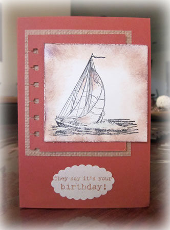 I love the card that my Mum made for Ron for his birthday and just had to share it here with you.  The Seaworthy stamp set is a fantastic one for male cards.  I love the way she has sponged and added just a hint of colour to the sails, the dimension she has created by adding a couple of smaller layers under the focal image and, of course, you can never go wrong with embossing.   Unfortunately the punch is a retired one, but it gives such a neat effect.  Thanks Mum, your talent is amazing.