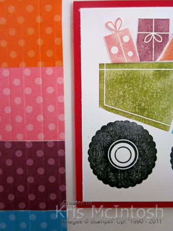 I punched the squares using my 1″ Square Punch from Designer Paper found in the Brights Patterns Designer Series Paper Stack. I attached them down the left hand side of Whisper White card stock and then embossed just the section with the Designer Paper using the Stripes Embossing Folder. I stamped the greeting from the Happiest Birthday Wishes stamp set using Pacific Point ink in the lower right hand corner of the Whisper White card stock. The Whisper White card stock is attached to a mat of Pacific Point card stock and then to scored and folded Whisper White card stock. I inked the truck image from the I Dig You stampset using Old Olive, Pacific Point and Basic Black Stampin’ Write Markers and stamped onto Whisper White card stock. I inked the present image from the same stamp set using Rich Razzleberry, Regal Rose and Tangerine Tango Stampin’ Write Markers, stamped onto a scrap of Whisper White card stock, cut the image out and then attached it so that it looked like the truck is carrying a load of presents. I attached the image panel to Real Red card stock and then to the card front using dimensionals.