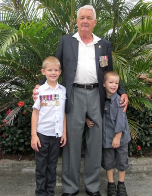 I just wanted to share with you a photo of my grandsons with their Great Grandfather. Yesterday both boys marched with my Dad in the Kallangur Anzac Day Parade.