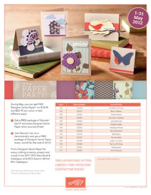 Stampin’ Up! has an exciting promotion for the month of May. If you buy 3 packages of Designer Series Paper, you get one free! That’s a saving of $18.95, so if you have been holding off buying some of our gorgeous designer paper, now is the time to do so.