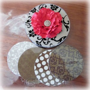 By scrunching each flower and then staking onto an Antique Brad, the flower gets a little more dimension. To finish off this little box, I used more of the Mocha Morning Specialty Designer Series Paper to make 4 coasters to go inside the box. My coasters consist of a layer of cork, then a layer of designer paper and then a layer of window sheet. I used the Big Shot Multipurpose Adhesive Sheets to adhere each layer and then cut the coasters using a 3-1/2″ Circle Die (non-Stampin’ Up!).