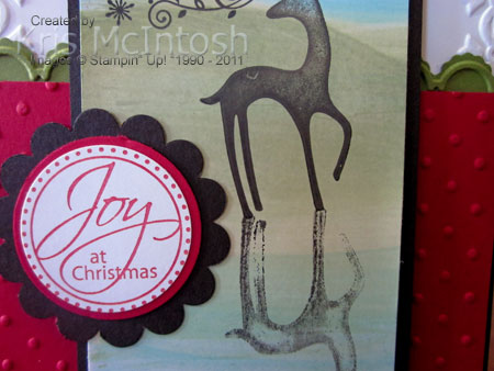 I embossed a piece of Whisper White card using the Framed Tulips Embossing Folder and attached it to scored and folded Early Expresso card.  I cut the long edge of a piece of Old Olive card using the scalloped Adorning Accents Edgelit Die, embossed it with the matching Adorning Accents Textured Impression Embossing Folder and attached it behind Real Red card which I embossed using the Perfect Polka Dots Embossing Folder.  This piece was then attached to the card front over the embossed Whisper White card.  To create the background for the stamped panel I added drops of Old Olive and Tempting Turquoise re-inkers to a baby wipe and swiped across Glossy White  card to get a mirror image effect.  I stamped Dasher over the background image and followed the tutorial instructions to get the mirror image.  I attached the image panel to Early Expresso card and then to the card front using dimensionalsI stamped the greeting from the Perfect Punches stamp set onto Whisper White card using Real Red ink.  I punched the greeting using the 1-1/4″ circle punch, added a Real Red 1-3/8″ circle and an Early Expresso 1-3/4″ scallop circle before attaching it to the front using dimensionals to the side so that I could attach it partially over the image panel.